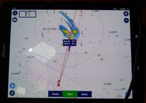 Zurück im Hafen haben wir uns noch beim Hafenmeister erkundigt, was die empfohlene Abfahrtszeit wegen der Gezeiten nach Helgoland ist. Passt mit dem zusammen, was wir auch ermittelt haben. Eine Stunde vor Niedrigwasser wäre laut Hafenmeister auch alles noch tief genug (mind. 2,50m). Obwohl wir dann doch noch etwas früher los sind, saßen wir schon wieder im Schlick. Mittlerweile nicht mehr ganz ungewohnt. Das Ablegemanöver verlief daher ganz langsam. Draußen auf der Nordsee kam der Wind wieder von vorne. Zuerst parallel zum Verkehrstrennungsgebiet und ab der Tonne TG9 Richtung Norden weitere 15 Seemeilen bis nach Helgoland.