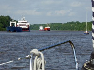 Am nächsten Tag fahren wir die restlichen 60 Kilometer weiter bis zu Schleuse Kiel Holtenau. Vor uns ziehen wieder die Frachter vorbei. Die Landschaft rechts und links vom Kanal ist wirklich sehr schön.