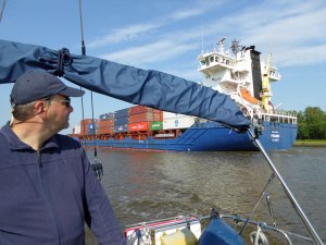 Mittlerweile hat der Wind aus Ost aufgefrischt und es steht viel Schwell im Hafen. Wir genießen dennoch einen weiteren Hafentag. Bekommen neue „Nachbarn“ ins Päckchen. Die wollen auch am nächsten Morgen nach Cuxhafen ablegen. Früh, bis spätestens um 6 Uhr. Um 4.30 Uhr dann gepolter auf unserem Vorschiff der Nachbar holt das Stromkabel und die Landleinen ein und ist bereit zum Ablegen. Wir sind jedenfalls nun auch wach. Die Nacht war wieder einmal kurz. Also stehen wir auch auf und legen gegen 5.30 Uhr auch ab. Diesmal können wir die Segel schon im Vorhafen setzen. Segel und Kurs stehen gut. Ab nach Cuxhaven. Mich überfällt die Müdigkeit und da es gerade für mich nix zu tun gibt, lege ich mich noch einmal in die Achterkoje. Bereit um schnell aufzustehen, falls Heiko noch eine helfende Hand benötigt. Zwischendurch frischt der Wind auf etwa 20 kn auf. Das Groß wird etwas gefiert und weiter geht es. Wir sind schnell. Der Strom läuft wieder mit und so sind wir bald in der Ansteuerung der Elbe. Zur Querung des Fahrwassers bin ich ausgeruht. So peilen wir gemeinsam die schnell anrauschenden Frachtschiffe an und fahren hinter dem einen und noch vor dem anderen durch. Geschafft! Segeln eingeholt. Die Elbe aufwärts geht wieder nur unter Motor. Der Wind steht gegen an und zum Kreuzen sind wir einfach zu müde. Im Jachthafen Cuxhaven noch kurz an der Tankstelle vorbei. Es gibt auch hier wieder den biofreien Diesel. Wir tanken gut 60 Liter nach und legen gegen 11.30 Uhr gleich einen Steg weiter an. Heiko legt sich bald schlafen. Ich bin wieder fit und mache einen kurzen Spaziergang in die Stadt, vorbei am Stadthafen und dann noch ein kurzer Einkauf. Als ich später im Hafen ankomme bezahle ich noch schnell den Liegeplatz beim Hafenmeister und bekomme den Zugangscode zu den Duschen. Heiko hat zwischenzeitlich ausgeschlafen. Kleiner Snack am Nachmittag und später fallen dann meine Augen zu. Abends sitzen wir gemütlich im Cockpit und können von unserem Liegeplatz die Schiffe auf der Elbe vorbeiziehen sehen. Hier spüren wir zum ersten mal den Sommer und können abends lange im Cockpit sitzen. Auf Helgoland war es doch noch ganz schön kühl mit dem Wind.