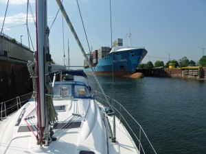 Das Segeln in den Tidengewässern ist nicht unser Ding. Klar der Strom schiebt schnell, aber immer das frühe Aufstehen. Du bist hier nicht wirklich frei in der Entscheidung loszufahren. Die Naturgewalten bestimmen deinen Törnplan gewaltig. Am nächsten Tag legen wir dann um 9.30 Uhr Richtung Brunsbüttel ab. Das sind ca. 15 Seemeilen und der Strom schiebt mit 2-3 Knoten mit. Endlich mal zu einer vernünftigen Ablegezeit! Wieder alles unter Motor, wie soll es anders sein, der Wind kommt von Osten. Überholt werden wir von vielen Frachtern und der englischen Marine. An der Schleuse zum NOK (Nord-Ostsee-Kanal) wird es dann spannend. Wo stehen jetzt die Signalmasten um uns freie Einfahrt zu gewähren? Wir warten eine halbe Stunde, dann leuchtet das weiße Gleichtaktfeuer. Vor uns ist noch ein Frachter eingefahren. Ein kleines Segelboot schleust noch mit uns. Der Skipper ist einhand unterwegs und hat unzählige Male den NOK schon passiert. Er gibt uns noch ein paar Hinweise. Noch müssen wir das Schraubenwasser des Frachters passieren. „de BARONES“ tänzelt da doch ganz schön, Heiko gibt beherzt Gas. Jetzt noch irgendwie festmachen. Von Bord auf die schwimmenden Ausleger springen, ist ganz schön tief. Muss irgendwie gehen und dann sind da keine Klampen zum Belegen, sondern nur Ringe. Aber funktioniert alles wunderbar. Wenige Minuten später öffnet sich das Schleusentor zum NOK. Der Skipper vor uns meinte noch: „Die Sportboote legen zuerst (schnell) wieder ab und bloß nicht abwarten bis das Schleusentor richtig auf ist. Die Berufsschifffahrt will uns schnell los werden.“ Gesagt getan, das können wir auch. Und weg sind wir. Wir wollen heute dann noch bis zur Schleuse am Gieselaukanal fahren. Dort gibt es idyllische und ruhige Liegeplätze. Gegen 16.30 Uhr legen wir dort an und Heiko geht noch zum Schleusenwärter und bezahlt die Kanalpassage. Die kostet 18 Euro. Wir packen am Abend noch den Grill aus und genießen diese Stille vor der Schleuse. Nachts der erste Regen und auch Gewitter.