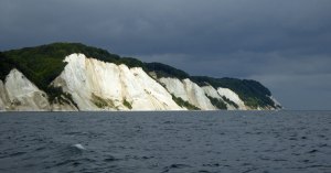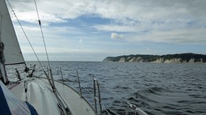 Wir haben doch erst gestern Tag ausgeschlafen ;-( Um halb sieben klingelt schon wieder der Wecker. Ablegen in einer Stunde. Wir wollen auch den Strom, der hier im Sund erheblich nach Süden setzt, noch mit nutzen. Schnell sind die Segel gesetzt. Halber Wind liegt an. Wir sind zügig unterwegs. Der Strom läuft gut 2 Knoten mit uns. Die Flieger gehen tief am Bug und Heck uns vorbei. An Steuerbord liegt gleich der Flughafen von Kopenhagen. Etwas mulmig wird uns, als wir gleich zwei Windhosen auf dem Wasser in nur 300 m Entfernung sehen. Aber wir haben doch normale Windverhältnisse! Das kann nur von den Fliegern kommen. Später erzählen uns andere Segler, dass sie stark richtungswechselnde Winde in Flughafennähe hatten. Das passt dann ins Bild, schnell weiter und weg von hier. Wie angekündigt dreht der Wind gegen 11 Uhr mehr auf Süd, auch der Strom lässt nach. Wir korrigieren die Segelstellung auf einen Amwindkurs. Später nimmt der Wind weiter zu. Wer hat den hier sportlich angekreuzt? Die Welle wird auch größer. Beide Segel werden ins erste Reff verkleinert. Weniger Ruderdruck, weniger Schräglage und wir werden auch tatsächlich schneller. Aber aus den direkten 32 Seemeilen werden dann letztendlich 44 Meilen. Wir müssen kreuzen. Später sind wir so weit unter Land, das die Welle etwas weniger ist. Wir wollen ankommen. Also packen wir die Segel ein und fahren die restliche Strecke entlang der Küste unter Motor. Das lohnt sich, den hier können wir die ersten Kreidefelsen bewundern.