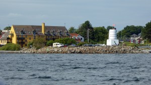 In Kyrkebacken gibt es noch einen „richtigen“ Hafenmeister mit Öffnungszeiten in seinem kleinen Büro. Sofort versammeln sich alle Segler und einer nach dem anderen nimmt an seinem Schreibtisch Platz, erhält Informationen zur Insel und die Hafengebühr wird bezahlt. Wir erhalten ein grünes (Schleifen)Band, welches am Schiff sichtbar zu befestigen ist. Später kann er auf seinem Rundgang dann so erkennen, ob auch alle bezahlt haben. Dann holt er noch die schwedische Flagge ein und schließt sein Büro wieder. Wir spazieren noch an der Küste entlang und folgen dem kleinen Pfad, der uns zu der kleinen Inselkirche führt. Von hier oben haben wir eine sehr schöne Aussicht über den Hafen und bis weit in den Sund.