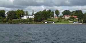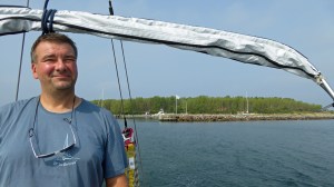 Am nächsten Tag sind wir fast die Letzten, die gegen Mittag den Hafen verlassen. Wir frühstücken erst gemütlich. Ich springe dann noch einmal in die Ostsee. Heiko betätigt sich mit Schrubber und Pütz um dem Schiff wieder etwas mehr „Glanz zu verleihen“ (= den gröbsten Dreck zu entfernen). Wir lassen uns treiben. Die Leinen sind ja schnell losgeworfen und der Wind kommt auch erst später. Eigentlich wollten wir noch die Insel Omø ansteuern, da aber der Wind am nächsten Tag schon mit 5-6 Bft wehen soll und auch noch Regen dazu angesagt ist, fahren wir heute mit dem Südwind direkt bis nach Nyborg durch. Wir motoren eine Stunde und dann können wir die Segel setzen. Wir ziehen an der Insel Omø vorbei über den großen Belt. Anders als erwartet ist hier nicht viel Schiffsverkehr. Es ist sehr diesig, daher können wir die große Beltbrücke nur erahnen. Der Wind nimmt wie vorhergesagt rasch zu. Kurz vor der Ansteuerung in das Fahrwasser nach Nyborg, schießt Heiko kurz in den Wind. Jetzt schnell die Genua eingerollt, es weht mit über 20 Knoten daher. Die restliche Meile lassen wir uns nur mit dem Groß treiben. Im Osthafen sind die ablandigen Liegeplätze schon belegt, aber so nah an der Straße im Osthafen wollte ich auch nicht liegen. Wir finden ausreichend Platz im Westhafen vor. Schnell kommt ein Segler vorbei und nimmt uns eine Leine ab. Wir kommen noch etwas ins Gespräch, die beiden werden wir in den nächsten Häfen auch immer wieder treffen. Am Abend sitzen wir noch im Cockpit und staunen nicht schlecht als mit dem auflaufenden Wasser zwei Schweinswale in dem Hafenbecken neugierig ihre Kreise ziehen.