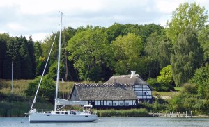 Am Abend schauen wir gemeinsam in die Seekarte. Wind aus SSE mit 4-5 Bft ist vorhergesagt. Vor uns liegt eine Inselgruppe im Smålandfahrwasser. Die Insel Vejrø liegt eigentlich genau auf der Strecke. Das ist eine kleine private Insel. Ein Multimillionär erfüllt sich hier seinen Traum vom ökologischen und nachhaltigem Wirtschaften. So gibt es einen Yachthafen, ein kleines Hotel mit Gästehäuser und Restaurant auf der Insel. Hier wird serviert, was auf der Insel wächst oder gehalten wird. Gäste sind herzlich willkommen! Die Hafengebühr von 350 DKK lässt uns etwas zögern. Wiederum haben wir in Schweden für viel Hafengebühr auch schon richtig schlecht gelegen. Also warum gönnen wir uns den Luxus der kleinen Insel nicht? So legen wir am nächsten Morgen kurz vor 9 Uhr ab. Kurz hinter der Hafeneinfahrt können wir gleich die Segel setzen. Wir gleiten auf einem gemütlichen Kurs dahin und frühstücken erst einmal. Hinter uns ist ein kurzes Atmen zu hören. Drei Schweinswale begleiten uns in diesen Morgen. Damit hätten wir so weit im Smålandfahrwasser nicht gerechnet. Der Strom setzt hier mit fast 2 kn mit uns und so sind wir zu Beginn richtig schnell unterwegs. Wir passieren zwei Brücken. Ab dann nimmt der Strom etwas ab. 26 Seemeilen sind es bis zu der Insel Vejrø und wir können bis zur Hafeneinfahrt segeln. Der Hafen ist fast leer.