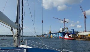 Heiko liest in den Handbüchern nach. Wir hatten die Bedieneinheit des Autopilotes im Winter zur Reparatur eingeschickt und im Frühjahr wieder eingebaut. Die Firma SIKOM-Bühler aus Kiel repariert auch alte Geräte, was sonst kaum noch anzufinden ist. Heiko ruft den Inhaber an, der auf seinem Gebiet sehr kompetent ist. Kurz das Problem geschildert und schon ist klar, der Autopilot muss neu kalibriert werden. Übrigens hatten wir mit anderen elektronischen Problemen bei Herrn Bühler immer per Ferndiagnose schnelle Hilfe erhalten. Sehr zu empfehlen die Firma. Wie kalibiert man also den Autopilot neu? Heiko hat den dreh raus und möchte dazu das ruhige Wasser im großen Hafenbecken in Nyborg für die Kreise nutzen, die wir drehen müssen. Alles funktioniert wie im Handbuch beschrieben und siehe da, jetzt können wir auch den Kurs mal ohne die Abweichungen am Autopilot einstellen. Wieder viel gelernt.