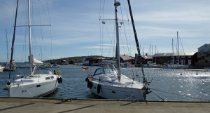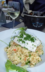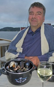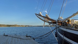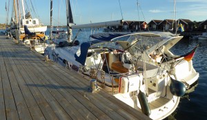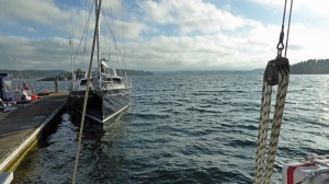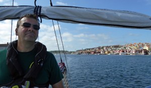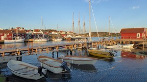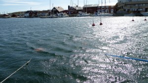 Am nächsten Tag legen wir erst gegen Mittag ab. Zunächst geht es unter Motor gegen den Wind Richtung Westen, nochmals unter der imposanten Seilbrücke bei Uddevalla durch. Dann setzen wir Richtung Süden nur Genua, auch weil heute der Wind wieder unberechenbar böig ist. Zum Schluß dreht der Wind mal wieder um 180 Grad. Bis nach Ljungskile sind es 13 Seemeilen und wir sind dafür gut 3 Stunden unterwegs. Zum Anlegen gibt der Wind noch einmal alles. Wir brechen den ersten Anlegeversuch ab. Kluge Entscheidung in letzter Sekunde! Der Anlegesteg ist mal wieder vom Wind völlig ungeschützt. Wir gehen jetzt an die andere Seite längsseits. Dort gibt es genau noch eine Klampe und einen Ring, den wir zum Anlegen nutzten können. Heiko bastelt später für das Legen von Vor- und Achterspring aus unseren Leinen an der Holzleiste des Schwimmsteges noch „Ringe“ an denen wir festmachen können. Man muss sich nur irgendwie zu helfen wissen. Aber so viel zum Thema Gastliegesteg! Das sind hier leider nicht die besten Plätze und bieten weniger Schutz. Auch wenn die Welle aus Südwest noch die ganze Nacht heftig an unser Heck klatschen wird, der Blick in die Bucht ist wunderschön. Vorbei an der Insel Orust haben wir immer wieder die Zuchtgebiete für die Muscheln gesehen. Wir haben von dem Restaurant „Muschelbaren“ gelesen und wollten daher nach Ljungskile. Ein sehr gemütlicher Abend, mit tollem Essen, sehr guten Service und Blick über die Bucht vom Restaurant. Heiko hat sich an den Muscheln erfreut und für mich gab es ein cremiges Risotto mit Fisch. Einfach lecker!!! Und erst der Nachtisch! Ein gute Flasche Riesling rundete das Menü ab. Fragt nicht nach dem Preis 😦 Aber man gönnt sich ja sonst nix 😉 Wir gehen hier in Schweden ja eher sehr selten Essen und kochen selbst.