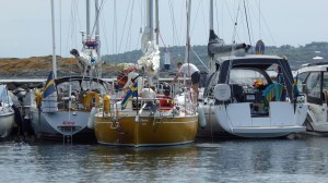 Das Wetter wird unbeständiger. Wir werden das im Auge behalten und nach einem Zeitfenster für unsere Reise nach Læsø schauen. Für das Wochenende ist viel Wind vorhergesagt. Wir fahren weiter Richtung Süden, vorbei an Marstrand. Auch hier waren wir damals mit Oliver und Ingrid. Schön war es, dennoch ziehen wir heute daran vorbei. Später können wir die Segel setzten und gleiten bei 3-4 Windstärken aus West mit halben Wind bis vor die Hafeneinfahrt der Insel Källö Knippla. Hier nutzen wir mal wieder unseren Bojenhaken, denn es sind Bojen zum Festmachen der Achterleine ausgelegt. Das Manöver klappt ganz gut. Einer nach dem anderen läuft in den Hafen ein und Heiko ist noch vielen Seglern behilflich. Wir werden hier bleiben, bis sich das Wetter beruhigt hat und wir ohne eine „alte“ Welle Richtung Südwesten fahren können. Der Hafen hat eine sehr gute Infrastruktur mit einem kleinen Ort, wo alle Versorgungsmöglichkeiten zu finden sind. Und erstaunlicherweise gibt es hier immer noch freie Liegeplätze. Das kennen wir schon gar nicht mehr. Nun liegen wir hier schon fünf Tage. Wie schnell die Zeit vergeht. Wir haben die Insel und den Ort erkundet, sind auf die Felsen für einen schönen Ausblick geklettert. Dann haben wir unser Schlauchboot vom Salzwasser gereinigt, getrocknet und zusammen gepackt. Die Achterkoje ist jetzt wieder gut belegt mit dem Schlauchboot und dem ganzen Zubehör. Wir werden das Dinghi nicht mehr benötigen und auf Deck stört es nur. Ständig bleibt beim Segeln die Genuaschot irgendwo hängen. Dann haben wir unser Schiff wieder in ein Wäscheschiff verwandelt. Da hatte sich einiges angesammelt. Es gab nur einen Wäschetrockner. Aber wir hatten ja nicht nur Wind sondern auch noch Sonne. Heiko hat den Anker und die Kette aus dem Ankerkasten gelegt und alles durchgespült. Hier hatte sich ausreichend stinkender Schlick angesammelt. Da für den nächsten sehr viel Wind vorhergesagt ist, belegen wir noch eine weitere Boje mit einer Achterleine. Die Logge wurde auch ausgebaut und gereinigt. Hoffentlich zeigt diese nun wieder korrekte Werte an. Eine Crew wollte, obwohl es starken Seitenwind gab, von der Boje ablegen und weiterfahren. Da fehlte eine helfende Hand und so ist Heiko beim Ablegen zu den beiden auf das Schiff. Später längsseits an der Tankstelle, dann aber wieder von Bord. Und so gibt es auch hier immer was zu entdecken, zu helfen und zu tun.