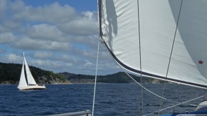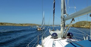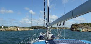 Am nächsten Tag kommt der Wind aus Süd. Da wollen wir auch hin 😦 …. und steht somit gegen an. Also entscheiden wir uns für die Tour durch die engen Fahrwasser, statt außen herum. Sehr beeindruckend! Wir haben uns das auf der Karte gründlich angeschaut und die Strecke passt vom Tiefgang. Aber wenn man dann direkt da durch fährt und die Felsen nur noch wenige Meter entfernt neben uns sind, fühlt sich das alles ganz schön aufregend an. Die Fahrrinnen sind (wie verzeichnet) alle ausreichend tief und es sind mit uns viele andere Segler unterwegs. Die Schweden nordwärts kommend segeln diese engen Stellen ganz entspannt. Also alles eine Frage der Gewohnheit und Übung.