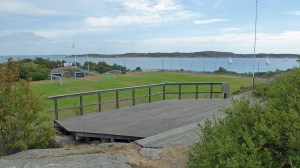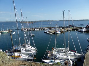 Am nächsten Tag holen wir gegen Mittag den Anker hoch. Wir versuchen unser Glück noch einmal und können an einer dänischen Segelyacht längsseits im Südhafen der Insel Stora Dyrön festmachen. Die Crew will in zwei Stunden ablegen. In der Zwischenzeit wird der Hafen voller und voller. Irgendwo schiebt sich immer noch ein Boot zwischen. Später beim Verholen lassen wir noch ein größeres Segelboot direkt an den Kai und gehen als zweite ins Päckchen. Schnell legt bei uns dann noch eine kleinere Bavaria Yacht an und das Päckchen ist nun auch voll. Kurzer Rundgang durch den Hafen direkt zum Eisladen, denn es ist auch hier so warm, so dass es nach einer Abkühlung verlangt. Zum Abend wird es kühler und wir wollen uns noch auf einen ausgedehnten Inselrundgang aufmachen. Die „Promenade“ ist ein angelegter Wanderweg über die Felsen mit sehr schönen Aussichtspunkten. Ein wunderschöner Blick auch zur Nachbarinsel Åstol, die wir auf einem Segeltörn vor vier Jahren mit Oliver und Ingrid schon zusammen besucht haben.