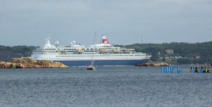 Wir fahren heute nicht in die beliebte Bucht Dannemark, die auch schon wieder gut besucht ist, sondern einige Meilen weiter in die geschützte Bucht bei Langö. Unterwegs bekommen wir zum einen noch etwas Welle aus dem Skagerak zu spüren, aber rechts und links ziehen die Motorboote an uns vorbei. Die machen noch mehr Welle. Es kann ja nicht schnell genug gehen. Später in der Bucht benötigen wir 5 Versuche bis der Anker hält! Wir fahren den Anker immer mit 1.000-1.500 U/Min ein. Bei den Schweden und Norweger fällt der Anker und gut ist. Hält der immer auf Anhieb, haben die anderes Ankergeschirr oder sind wir nur immer übervorsichtig? Wir kommen dem Geheimnis nicht auf die Spur. Unser Anker hält jetzt auch. Am Abend zieht noch eine Gewitterfront vorbei. Wir bekommen noch etwas Wind ab und sind froh den Anker sorgfältig eingefahren zu haben. Später gegen 23 Uhr hören wir doch noch Kühe?! Und tatsächlich laufen die Kühe über die Schären am steinigen Ufer entlang. Wir hören das plätschern der Hufen im Wasser. Einige Crewmitglieder, die noch auf der „Hunderunde“ unterwegs waren, können sich auf einer naheliegenden Treppe „retten“. Damit hat hier keiner gerechnet. Die Kühe sind unbeeindruckt und gehen ihren Uferweg weiter. Es hat den Anschein, als ob sie diesen Weg jeden Abend laufen.