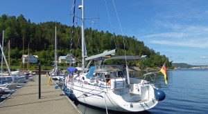 Für die nächsten Tage ist mehr Wind mit Gewitterlagen vorhergesagt. Daher suchen wir uns einen Hafen. Im Revierführer steht geschrieben, der Sannäsfjord lohnt einen Abstecher. Am Ende des Fjord liegt ein kleiner Ort mit einem Gästehafen. Nicht viel Platz und kaum Infrastruktur, aber genau das macht es ja so lauschig. Im Winter leben hier nur sehr wenige Einwohner. Im Sommer ist dagegen alles belebt. Ein kleiner Zeltplatz liegt neben unserem Hafen. Und ansonsten gibt es nix. Kein Kaufmann, kein Restaurant und daher ist der Hafen in der Hochsaison zwar gut besucht, aber es gibt noch einen guten Platz zum Anlegen. Es ist heute Sonntag und die Schweden und Norweger scheinen alle auf dem Wasser unterwegs. Rushhour! So fühlt es sich zumindest an. Die Motorboote rauschen schnell an uns vorbei und wir taumeln immer wieder durch die Wellen. Sog und Wellenschlag vermeiden! Das kennt hier keiner. Es sind nur ca. 10 Seemeilen und wir ziehen langsam mit der Genua um die Schären und den Sund.